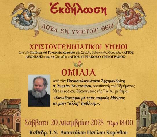 Η Ιερά Μητρόπολη γνωστοποιεί ότι το Σάββατο, 20 Δεκεμβρίου 2025 και ώρα 6:00 μ.μ., στη Νέα Αίθουσα Γεύματος Αγάπης στον Καθεδρικό Ι. Ναό Αποστόλου Παύλου Κορίνθου θα πραγματοποιηθεί εορταστικὴ εκδήλωση…