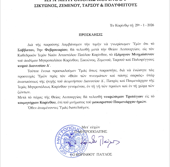 Εθιμοτυπική επίσκεψη πραγματοποίησαν σήμερα Τετάρτη, 26 Νοεμβρίου 2025, ο Πρόεδρος κ. Γεώργιος Παπαμιχαήλ και ο Γραμματέας κ. Γεώργιος Λιάκουρας του Συλλόγου Επαγγελματιών Αρχαίας Κορίνθου «Η ΤΡΙΗΡΗΣ» στον Σεβασμιώτατο Μητροπολίτη μας κ. Παύλο.