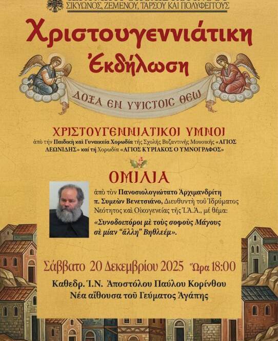Χριστουγεννιατικη εκδηλωση της ι. μητροπολεως Κορίνθου με ομιλητη τον πανοσ. αρχιμ. π. συμεων βενετσιανο